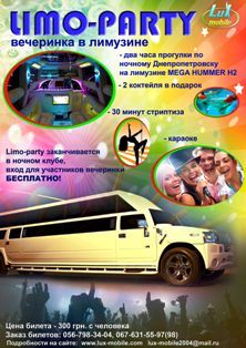 Приглашаем в наш мир! Мир, в котором сочетаются дорогие лимузины со вспышками фотографов, а остаются и яркие, незабываемые и неизгладимые впечатления!!! Такой формат вечеринок, предлагаемый компанией "GRANDLIMO", когда два часа проведенные в кругу новых знакомых и друзей в лимузинах LUX класса пролетят незаметно потому, что ему способствует общение и тот неповторимый шарм, который царит на таком событии, а посещение одного из лучших ночных клубов города завершит увлекательное путешествие.